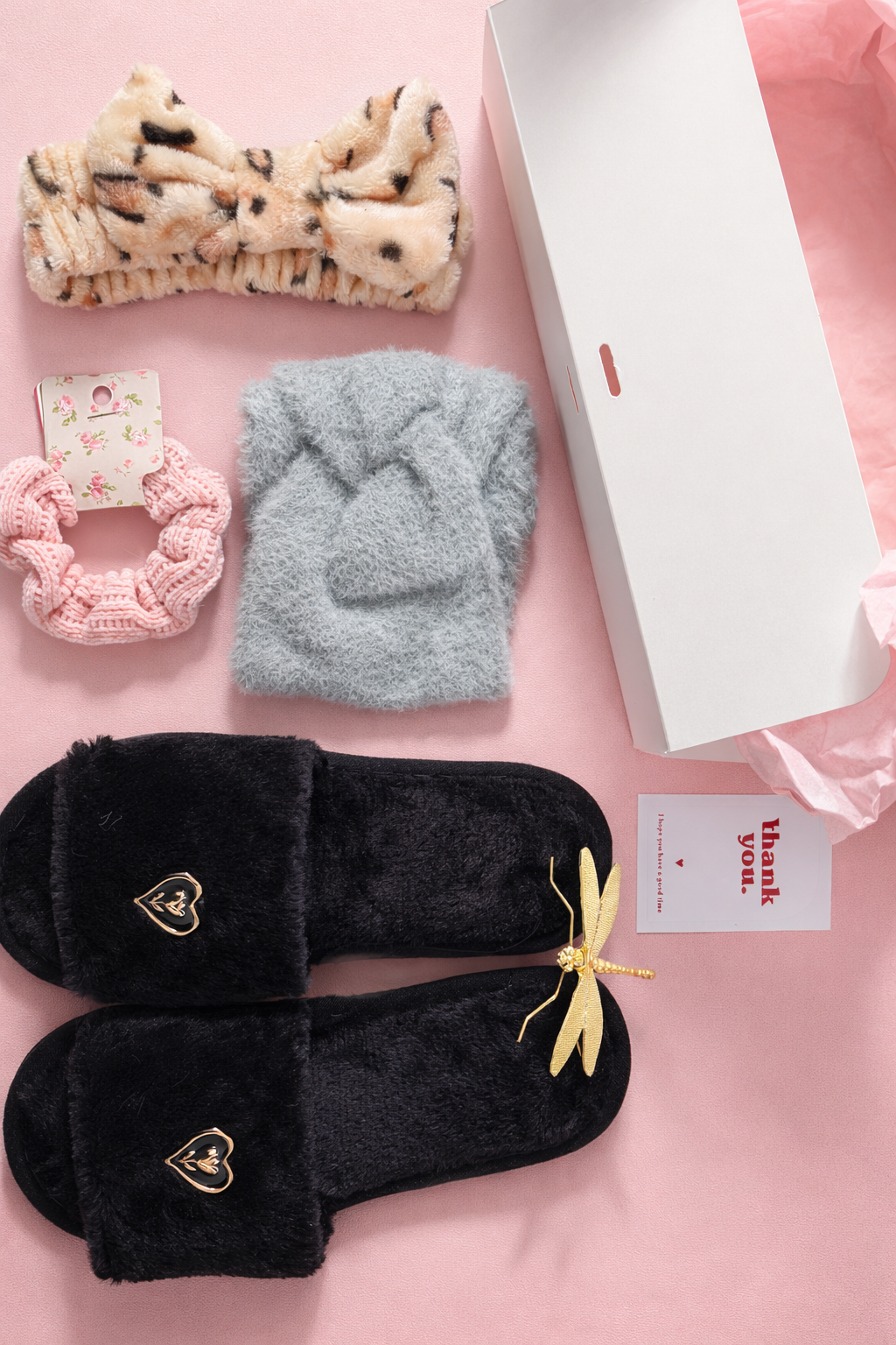 BOX RITUAL ESPECIAL, compuesta por pantuflas negras con detalle en corazón, diadema gris extra suave, diadema para ritual de limpieza facial con impresión animal print, coleta rosa, entre otros accesorios y de regalo un PIN muy especial.